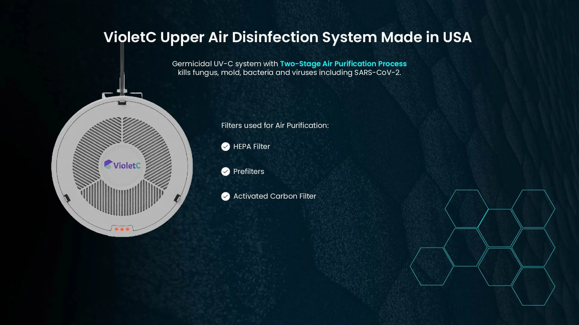 VioletC Upper-Air Disinfection System air disinfection systems use ozone-free and safe UV-C technology to ensure the air you breathe is clean and free of contaminants, bacteria, viruses and fungus.